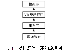 模擬板的顯示信號驅(qū)動是通過一臺計算機通過RS232串口控制的。在后臺運行的VB驅(qū)動程序從同一臺計算機上運行的組態(tài)王獲取數(shù)據(jù)。該計算機通過以太網(wǎng)獲取工業(yè)現(xiàn)場安裝的各種傳感器采集的信息,并通過DDE技術(shù)將數(shù)據(jù)傳輸?shù)侥M板驅(qū)動程序,從而實現(xiàn)模擬板動態(tài)顯示現(xiàn)場設(shè)備的運行情況。模擬板信號驅(qū)動的原理如下圖所示。