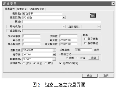 DDE通信始終發(fā)生在客戶應(yīng)用程序和服務(wù)器應(yīng)用程序之間。本文作者使用Visual Basic可視化高級編程語言編寫了模擬板的驅(qū)動程序。在Visual Basic的可視化編程工具中,DDE通過控件的屬性和方法來實現(xiàn)連接,其過程通過應(yīng)用程序名(application)、主題(topic)和項目(item)這三個標識名進行約定。例如,"有功功率"變量通過現(xiàn)場電量采集模塊(采用山東力創(chuàng)EDA9033)進行采集,組態(tài)王建立了"EDA9033"設(shè)備和"有功功率"變量,并允許DDE訪問數(shù)據(jù),如下圖所示。